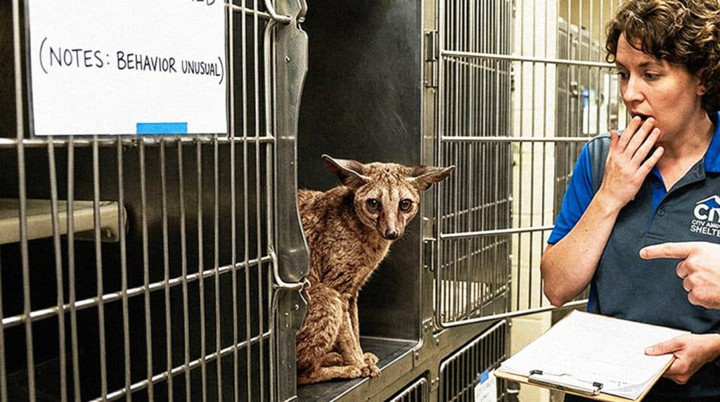 The staff at Riverside City Animal Shelter arrived on a Monday morning to find a wire crate sitting by the front door. There was no owner in sight, no paperwork, and no name tag on the animal inside. Just a small brown cat with oversized ears and sharp golden eyes staring out through the bars. Taped to the top of the crate was a handwritten note on yellow paper.
