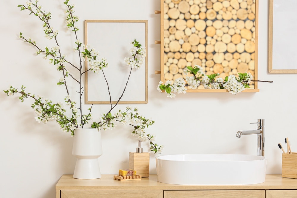 Adding greenery is a simple way to bring life into your bathroom. Many plants thrive in humid environments, such as pothos, ferns, and peace lilies. If your bathroom lacks natural light, high quality artificial plants can still provide the same visual softness. Wooden accents like a small stool or bamboo storage boxes can also warm up a space dominated by tile and porcelain. Incorporating natural elements is a subtle yet effective approach to update your bathroom cheaply while creating a spa like atmosphere.